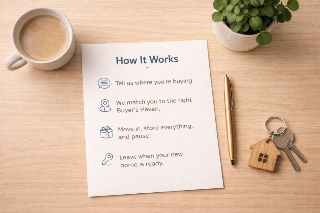 The Buyer’s Haven provides a calm, practical way to bridge the gap between homes, combining weekly furnished living with secure container storage so you can wait without pressure and move forward on your own timeline.